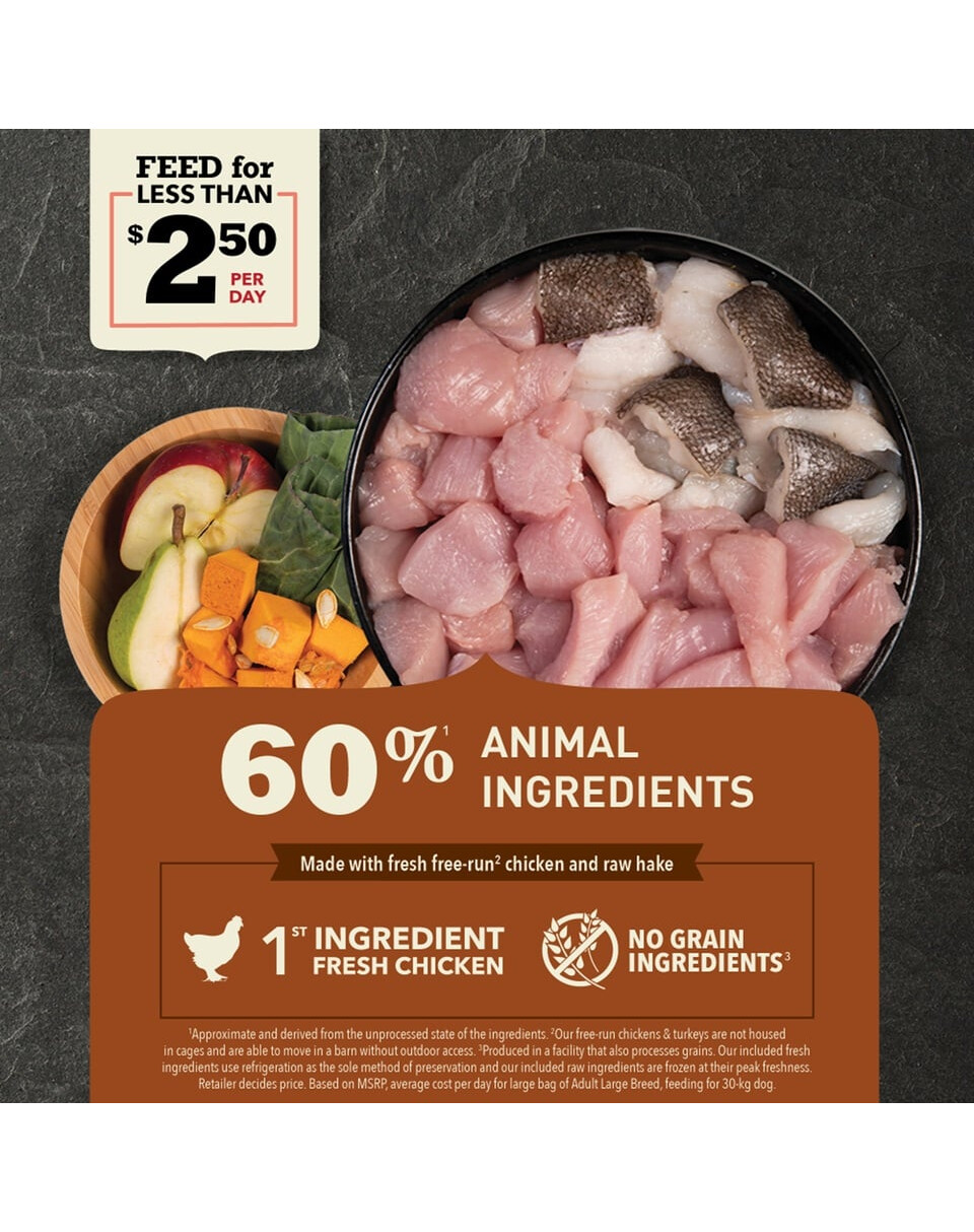 Sastāvdaļas: Vistas milti, tvaicēti auzas, svaigi bezmaksas palaist vistas, zirņi, svaigs atkaulotu lasis (avots DHA), brūnie rīsi, vistas tauki (konservēti ar tokoferolu un rozmarīna), vistas aknas, svaigas veselas olas, saulē kaltēta lucerna , lašu eļļa, ķirbju, vistas skrimslis (dabīgs glikozamīna un hondroitīna), Red Delicious āboli, burkāni, rāceņu laksti, dzērvenes, Saskatoon ogu, organiskie jūras dārzeņi (brūnaļģes, pūšļaļģe, dulse), diždadža sakne, zefīrs sakne, kadiķogas , Grieķu, saldā fenheļa, angelica root, smiltsērkšķu, cigoriņu saknes, durstīšana nātres, sarkano aveņu lapas, piena dadzis, piparmētru lapas, kliņģerīšu ziedi, kumelīšu ziedi, Enterococcus faecium, Lactobacillus acidophilus.