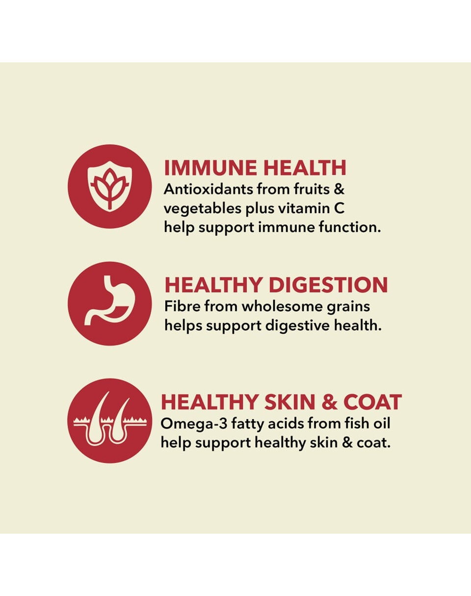 Barība, kas izstrādāta, lai apmierinātu suņu sugu vajadzības. Izgatavota no augstas kvalitātes sastāvdaļām, kas nodrošina augstu sagremojamību un labas garšas īpašības. Piemērota jutīgiem suņiem. Liels gaļas īpatsvars barībā nodrošina augstu dzīvnieku olbaltumvielu līmeni. Suņiem vislabāk ir nodrošināt olbaltumvielas no vairākiem avotiem, šajā barībā tā ir jēla jēra gaļa, dehidrēta jēra gaļa un cūkgaļa. Šāda dažādība nodrošina, ka tiek nodrošinātas visas pareizai augšanai nepieciešamās vielas. Augstais dzīvnieku izcelsmes olbaltumvielu saturs veicina reģenerāciju, kā arī muskuļu masas, kaulu un locītavu veidošanos.