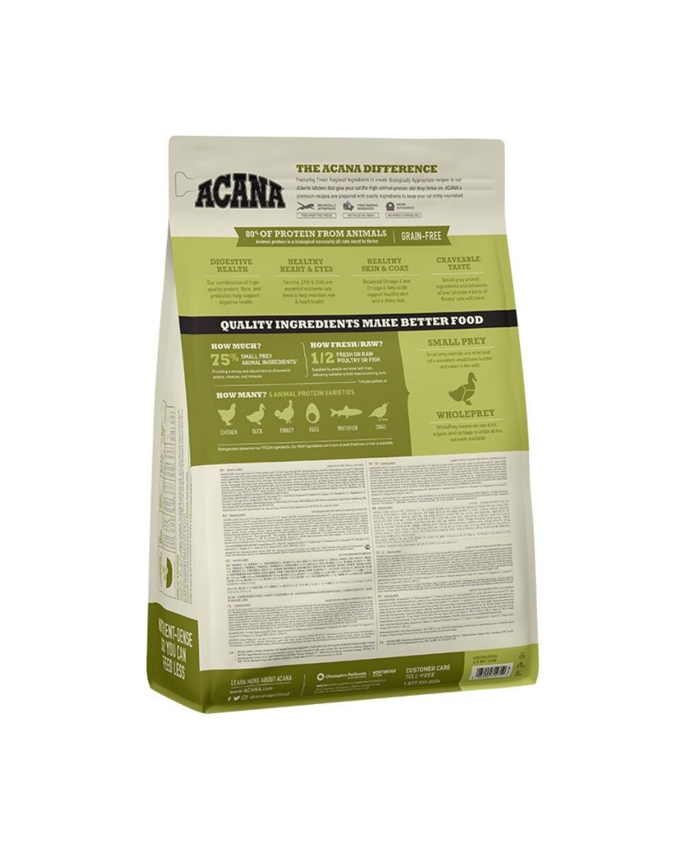Visa Acana barība cenšas atkārtot senču kaķu dabisko uzturu un ir balstīta uz pašreizējām zināšanām par gaļēdāju vēlmēm. Tiem raksturīgas veselas plēsoņas proporcijas. To pamatā ir dažādu dzīvnieku olbaltumvielu avotu maisījums, kam pievienoti dārzeņi un augļi, garšaugi un ogļhidrātu savienojums - lēcas, aunazirņi. Tāpēc barībā ir ierobežots ogļhidrātu daudzums - vismazākais no visiem sausās barības veidiem - aptuveni 25 %. Tajā pašā laikā tie nekairina kaķu kuņģus un netraucē gremošanas procesu. Zems glikēmiskais indekss samazina aptaukošanās risku un nerada cukura līmeņa paaugstināšanos asinīs. Ēdiens satur gaļu, orgānus un skrimšļus, kas atspoguļo visu plēsēja nomedītā dzīvnieka organismu.