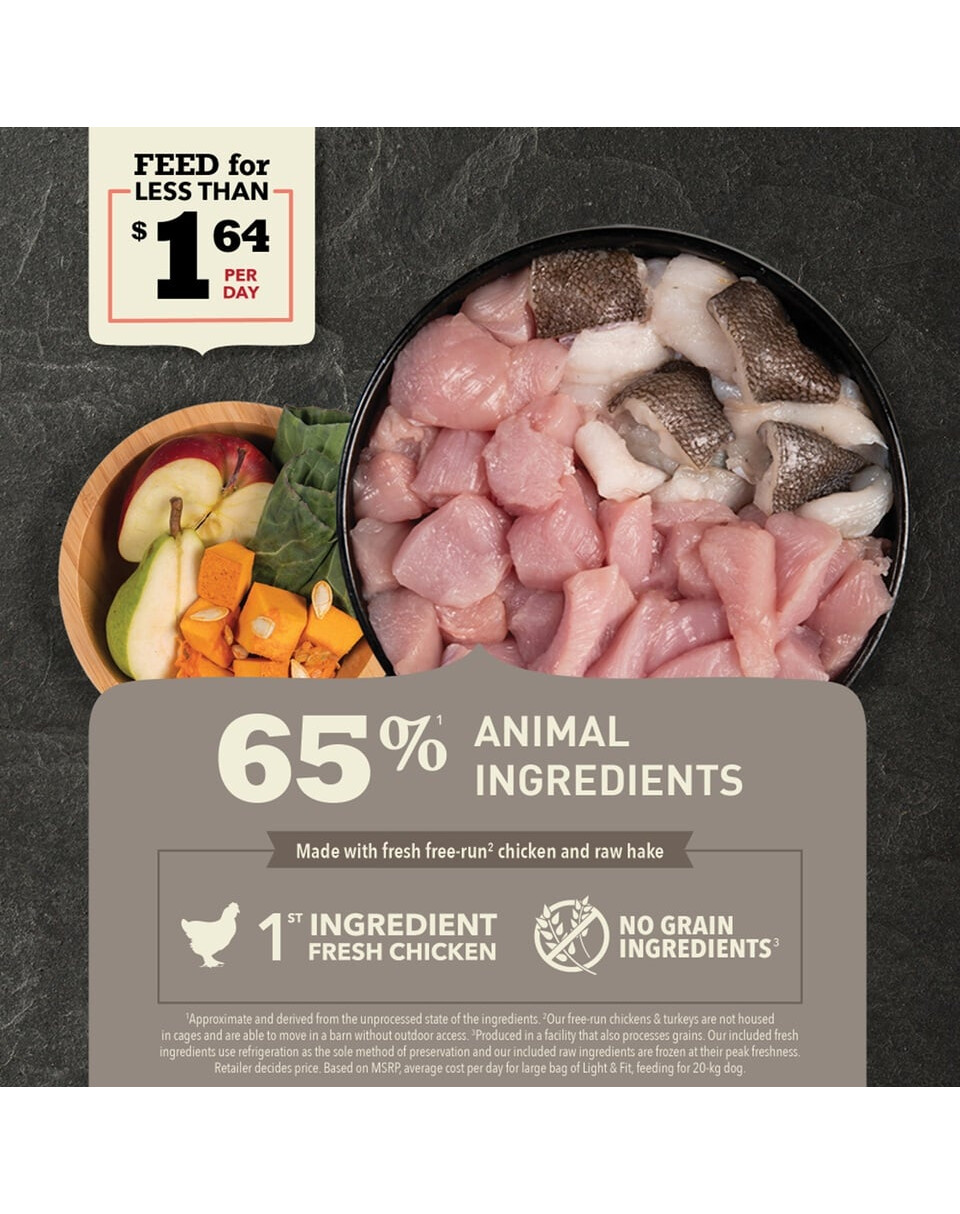 Izstrādāti, lai veicinātu liesās ķermeņa kondicionēšana, Acana LIGHT & FIT ir piekrauts ar piemaksu gaļas (55%), tostarp bezmaksas, palaist vistas un olas no mūsu vietējā prēriju saimniecības un lasi no Vancouver vēsā Klusā okeāna ūdeņos-visu piegādāto FRESH.High-proteīnu un zemu ogļhidrātu, lai atbilstu dabas uzturu, Acana ir bez kviešu, kukurūzas un glutēniem. Tas ir izgatavots no tvaicētiem augļu, dārzeņu un auzas zemu glikēmisko sastāvdaļām ar dažiem no vienkāršos cukurus, kas saistīti ar svara gain.Free antibiotiku un pievienotās hormoni, mūsu bezmaksas palaist vistas ir graudu baro vietējā prēriju saimniecībās un par derīgu cilvēku uzturā pirms ierašanās pie mūsu durvīm svaiga nekad iesaldēti un bez preservatives.The perfektu olbaltumvielu, mūsu Canada A kategorijas olas piegādā mums svaigu (nekad saldēti, bez konservantiem) no Albertas Prairie Farms.Simply labākais avots DHA un EPA neaizstājamās taukskābes, Klusā okeāna laši (ieskaitot Chinook un Coho sugas), ir nozvejotas off North Vancouver Island, pildīta ar ledu, un piegādā mūsu durvīm svaigu (nekad saldēti, bez konservantiem)