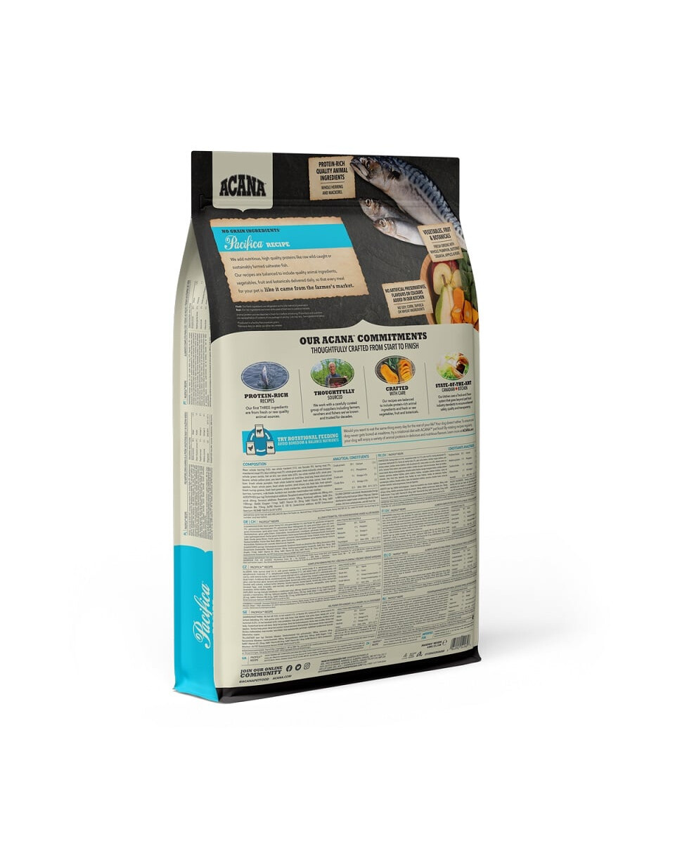 Receptē ietilpst 70 % zivju, kas iegūtas no dabiskās nozvejas Kanādas Klusā okeāna ziemeļu daļas ūdeņos. Izmanto sardīnes, siļķes, plekstes, mencas, merlanga, heka un laša eļļu. Tādējādi barība ir bagāta ar viegli sagremojamām olbaltumvielām un tajā ir daudz veselīgu tauku un nepiesātināto taukskābju Omega-3 un -6. Zems ogļhidrātu līmenis novērš cukura līmeņa paaugstināšanos asinīs un tādējādi samazina diabēta un pārmērīgas apetītes risku suņiem. Augsts vērtīgo olbaltumvielu daudzums nodrošina ātrāku un ilgāku sāta sajūtu. Turklāt šis sastāvs palīdz uzturēt ķermeni labā stāvoklī un kopj dzīvnieka muskuļus un kaulus. Zivis ir lielisks veselīgo tauku, olbaltumvielu un nepiesātināto taukskābju avots, kas stiprina sirdi, smadzenes un uzlabo ādas un kažoka stāvokli. Augļu, dārzeņu un garšaugu pievienošana ēdieniem uzlabo to garšas īpašības un aromātu. Āboli, bumbieri un ķirbji nodrošina dabiskus vitamīnus un antioksidantus, kas veicina imūnsistēmas darbību.