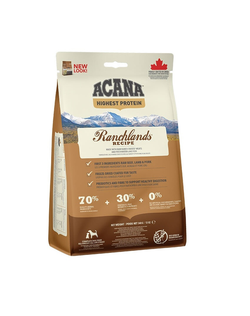 Neapstrādāta liellopu gaļa (9 %), neapstrādāta jēra gaļa (8 %), neapstrādāta cūkgaļa (8 %), dehidrēta liellopu gaļa (8 %), dehidrēta jēra gaļa (8 %), dehidrēta cūkgaļa (7 %), veseli zaļie zirņi, veselas sarkanās lēcas, veseli aunazirņi, liellopu tauki (5 %), jēlas liellopu aknas (4%), jēlas cūkgaļas aknas (4%), svaigas saldūdens zivis* (4%), veselas zaļās lēcas, veselas pinto pupiņas, veseli dzeltenie zirņi, zirņu ciete, jēla bizonu gaļa (2%), zivju eļļa (2%), lēcas šķiedrvielas, jēra aknas (0,5%), jēra kuņģis (0,5%), kaltētas jūraszāles, sāls, liofilizēta liellopu gaļa un liellopu aknas, svaigi veseli ķirbji, svaigi veseli muskuskirbji, svaigi veseli burkāni, svaigi veseli āboli, svaigi veseli bumbieri, svaigas veselas cukini svaigi kāposti, svaigi spināti, svaigas rāceņu lapas, svaigas biešu lapas, nesadalītas dzērvenes, nesadalītas mellenes, nesadalītas saskatoņu ogas, kurkuma, piena dadzis, dadzis, dadzis, lavanda, baldriāna sakne, mežrozītes.