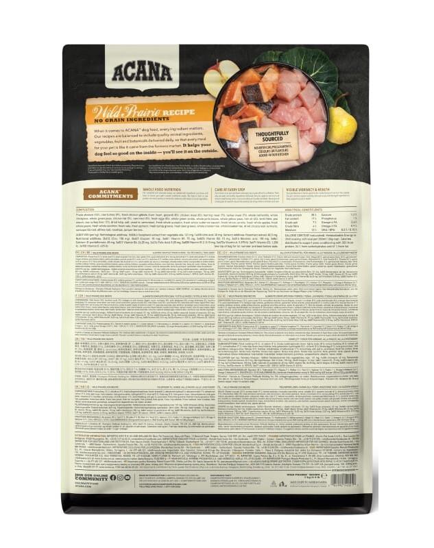 Svaiga vistas gaļa (11%), neapstrādāta tītara gaļa (9%), svaigi vistas orgāni (aknas, sirds) (9%), dehidrēta vistas gaļa (9%), dehidrēta siļķe (9%), veseli zaļie zirņi, veseli sarkanie lēcas, veseli aunazirņi, svaigas saldūdens zivis* (6 %), dehidrēta tītara gaļa (6 %), olas (4 %), vistas tauki (4 %), veselas zaļās lēcas, veselas pinto pupiņas, veseli dzeltenie zirņi, lēcas šķiedrvielas, zivju eļļa (2 %), zirņu ciete, jēlas tītara aknas (1 %), kaltētas jūraszāles, sāls, liofilizēta vistas gaļa un vistas aknas, svaigs vesels ķirbis, svaigs vesels muskuskirbis, svaigi veseli burkāni, svaigi veseli āboli, svaigi veseli bumbieri, svaigi veseli kabači, kaltētas cigoriņu saknes, svaigi kāposti, svaigi spināti, svaigas rāceņu lapas, svaigas biešu lapas, nesadalītas dzērvenes, nesadalītas mellenes, nesadalītas saskatoņu ogas, kurkuma, piena dadzis, dadzis, dadzis, lavanda, baldriāna sakne, mežrozītes.