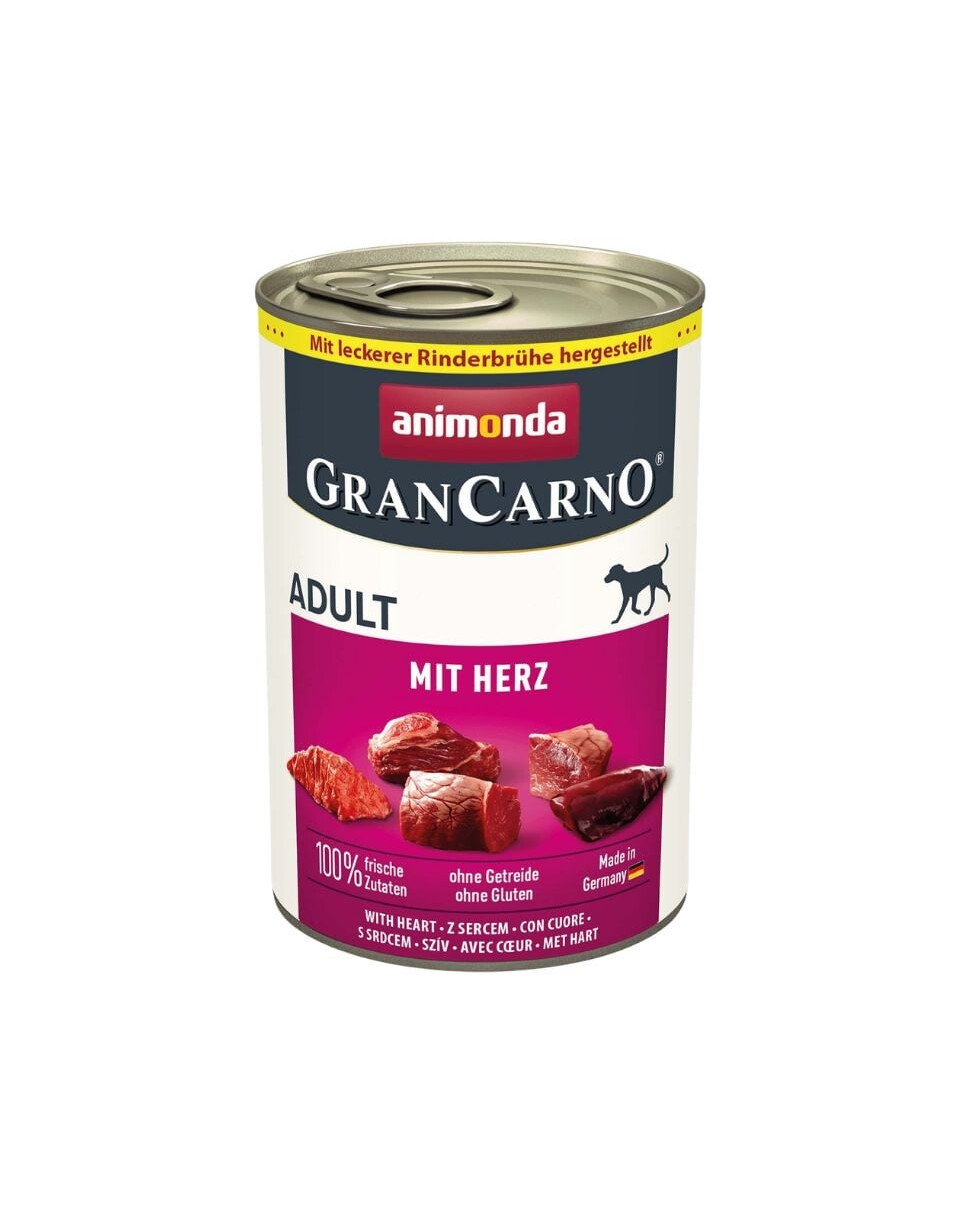 ANIMONDA GranCarno Adult ir sabalansēta mitrā barība pieaugušiem suņiem no 1 līdz 6 gadu vecumam, kas pagatavota no liellopa gaļas un liellopa sirdīm.