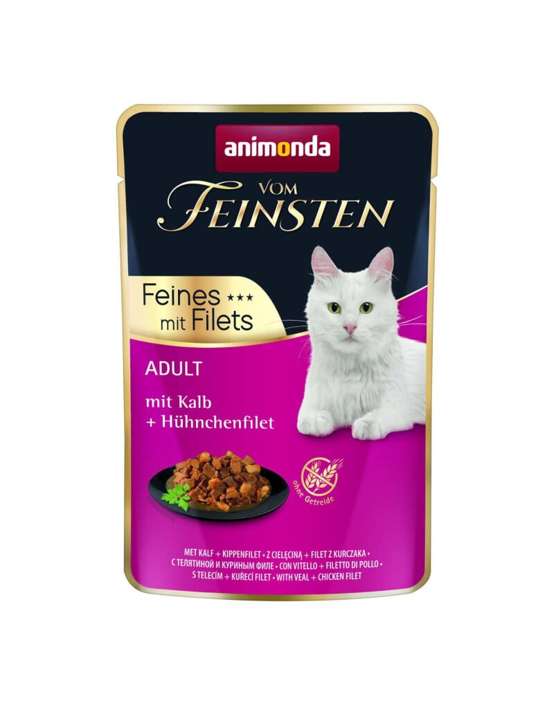 Vom Feinsten Pieaugušajiem Fines ar filetiem ir pilnvērtīga barība, kas izstrādāta pieaugušiem kaķiem vecumā no 1 līdz 6 gadiem, apvienojot maigus teļa gaļas gabaliņus ar izcilu vistas filetu. Gaļas fragmenti, kas iemērkti aromātiskā mērce, nodrošina izcilas garšas pieredzi, kas noteikti patiks pat visprasīgākajiem mājdzīvniekiem.