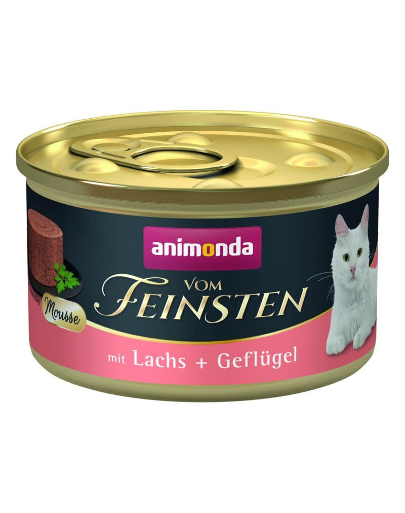 Vom Feinsten Mousse ar lasi un putnu gaļu ir pilnvērtīga, maiga barība mus veidā, kas paredzēta pieaugušiem kaķiem vecumā no 1 līdz 6 gadiem. Recepte nodrošina sabalansētu uzturu un izcilu garšu, ko labprāt izvēlas pat izvēlīgi kaķi.