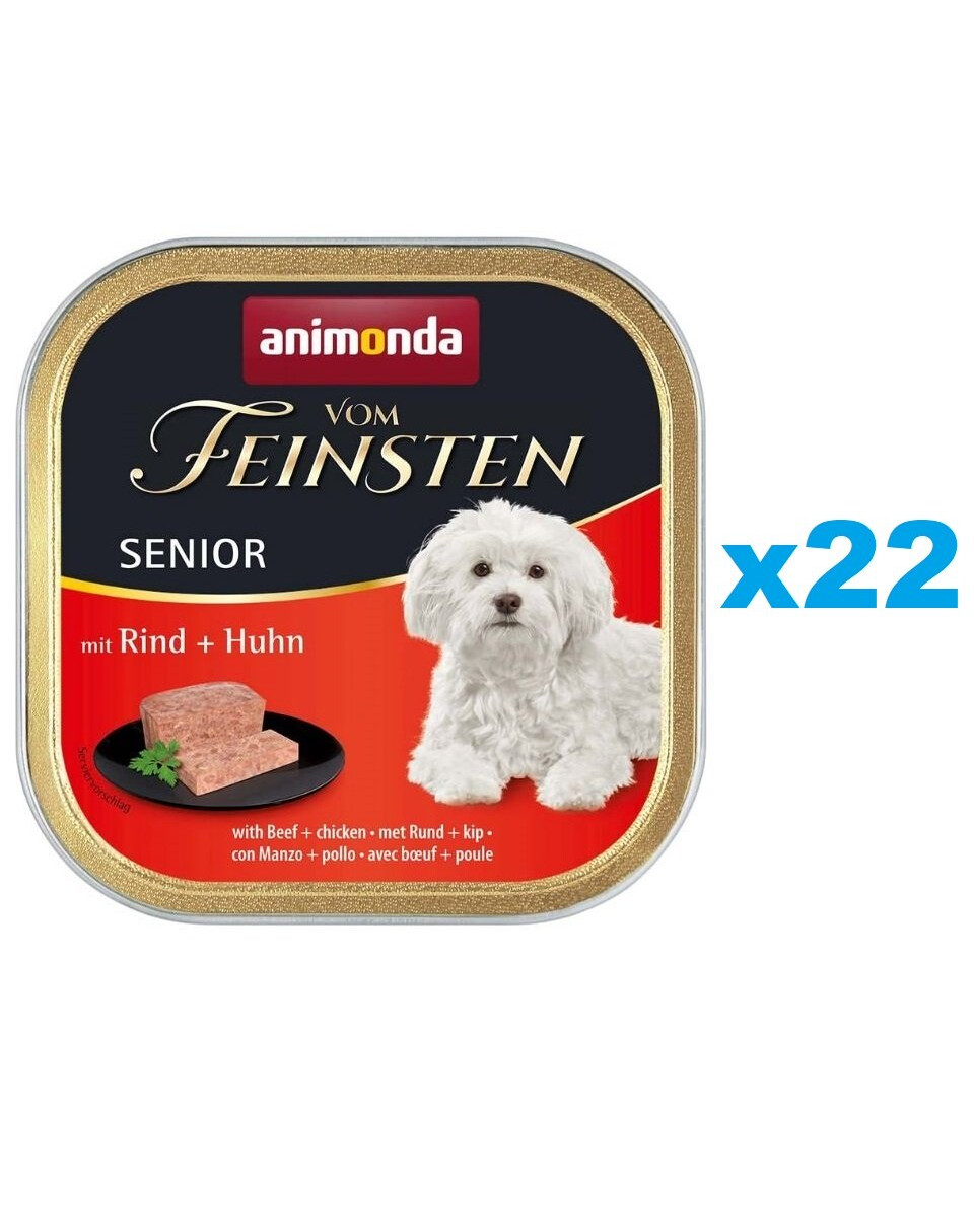 ANIMONDA Vom Feinsten Senior ir garšīga mitrā barība, kas nodrošina vecākiem suņiem virs 7 gadu vecuma visas nepieciešamās uzturvielas, kas īpaši pielāgotas viņu specifiskajām prasībām. Vom Feinsten Senior barība ir piemērota vecākiem suņiem ar augstām prasībām, un tās sastāvā nav graudaugu, sojas un cukura.