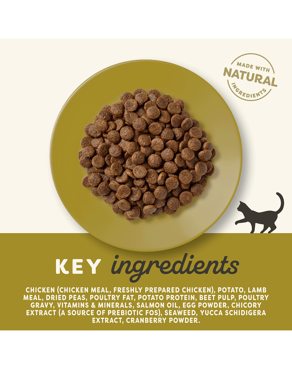 Žāvēta vistas gaļa (48%), žāvēta jēra gaļa (20%), žāvēti kartupeļi, atkaulota malta vistas gaļa (12%), biešu mīkstums, mājputnu mērce, laša eļļa, vitamīni un minerālvielas, žāvētas olas, augu celulozes šķiedrvielas (0,03%), nātrija hlorīds, kalcija karbonāts, jūras aļģes, dzērvenes, dl-metionīns, kālija hlorīds, jukas ekstrakts, citrusaugļu ekstrakts, rozmarīna ekstrakts.