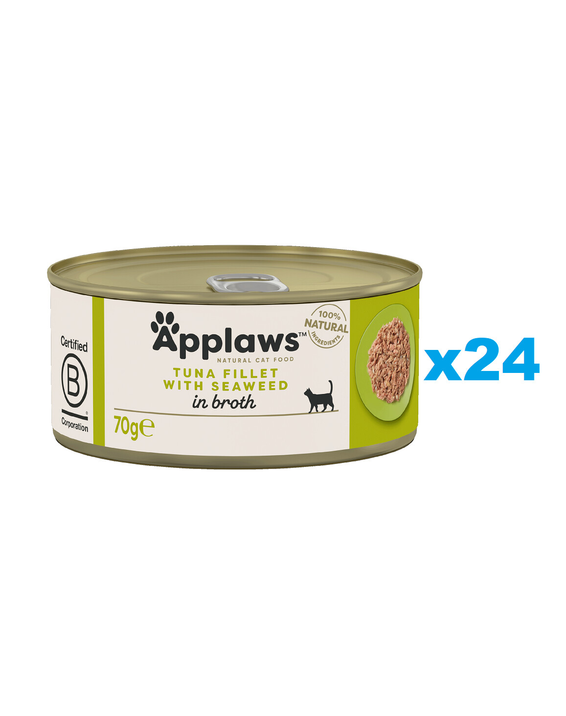 Tunča fileja 70%, rīsi 1%, jūras aļģes 5%, zivju buljons 24%. Bez piedevām.