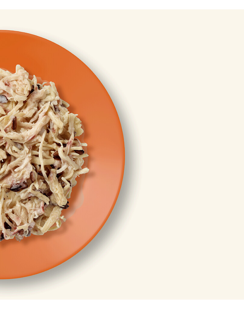 Ēdiens satur atlasītas sastāvdaļas - tīras vistas gaļas gabaliņus, kam pievienoti rīsi un ķirbji. Ievērojams dārzeņu piedevas daudzums palielina šķiedrvielu daudzumu, tāpēc var palīdzēt kaķiem, kas cieš no aizcietējumiem.