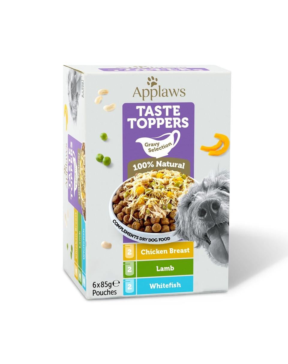 Applaws Dog Taste Toppers Gravy Selection ir dabisks papildinājums paciņu formā, kas izstrādāts, lai papildinātu ikdienas sauso barību pieaugušiem suņiem.