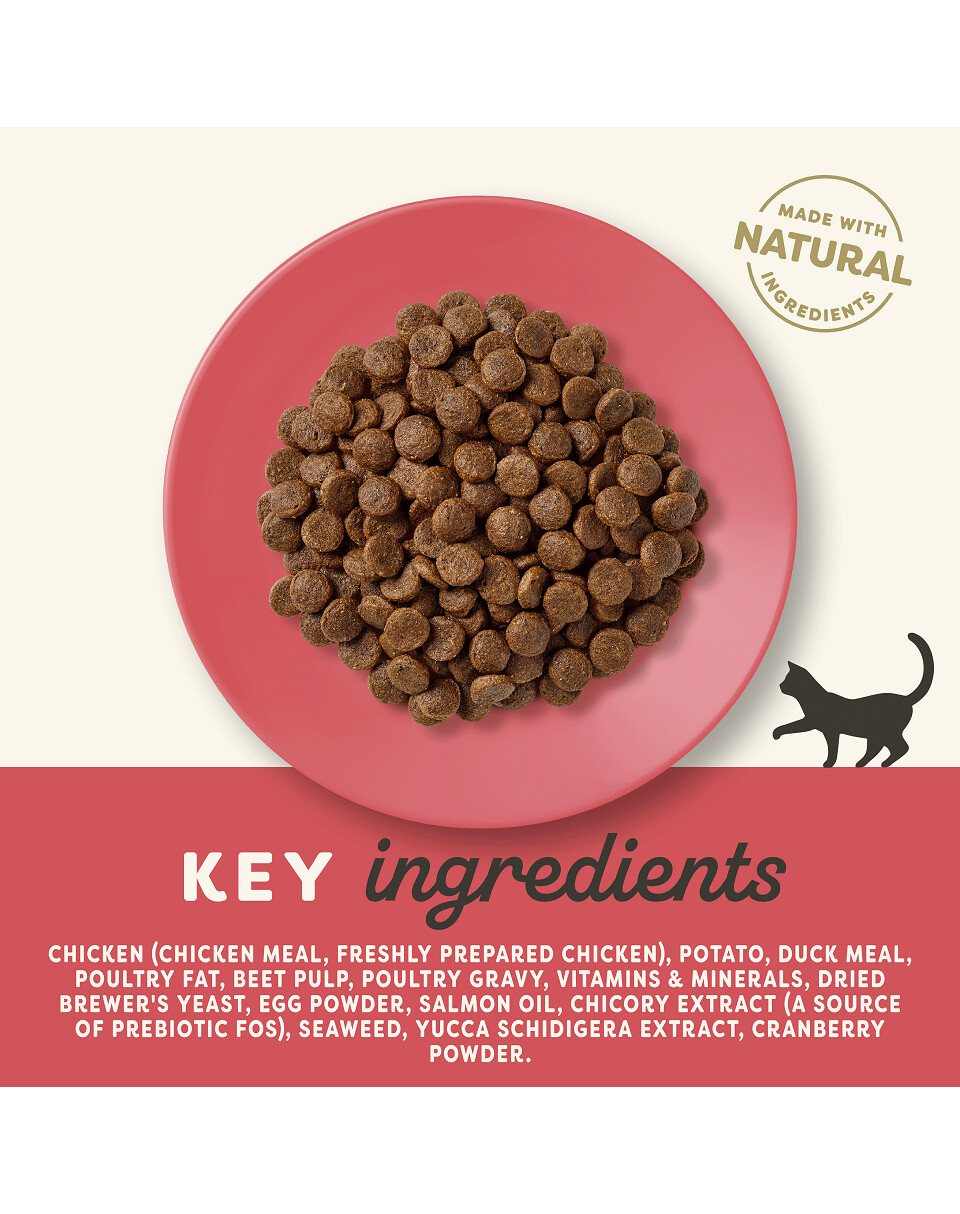 Vistas milti (47%), pīles milti (21%), svaigi malta mājputnu gaļa (16%), kartupeļi, biešu mīkstums, alus raugs, mājputnu mērce (1%), laša eļļa, vitamīni un minerālvielas, žāvētas olas, augu celulozes šķiedrvielas (0,03%), nātrija hlorīds, kalcija karbonāts, jūras aļģes, dzērvenes, dl-metionīns, kālija hlorīds, juku ekstrakts, citrusaugļu ekstrakts, rozmarīna ekstrakts.