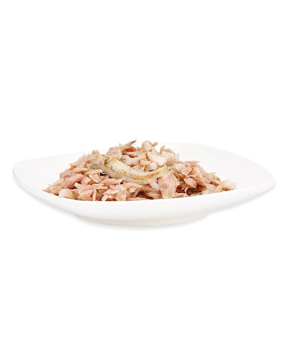 Tunča fileja: 60%, zivju buljons: 24%, anšovi: 5%, jūras aļģes: 5%, rīsi: 2%.