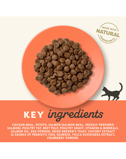 Žāvēta vistas gaļa (50%), žāvēts lasis (13%), svaiga vistas gaļa (13%, Omega-6 avots), kartupeļi, svaigs lasis 6%, biešu mīkstums, alus raugs, laša eļļa (1%, Omega-3 avots), mājputnu gaļas mērce (1%), zivju mērce (0,5%), vitamīni un minerālvielas, žāvēta vesela ola, celulozes šķiedrvielas (0,03%), nātrija hlorīds, kalcija karbonāts, jūras aļģes/ aļģes, dzērvenes, DL- metionīns, kālija hlorīds, juku ekstrakts, citrusaugļu ekstrakts, rozmarīna ekstrakts.