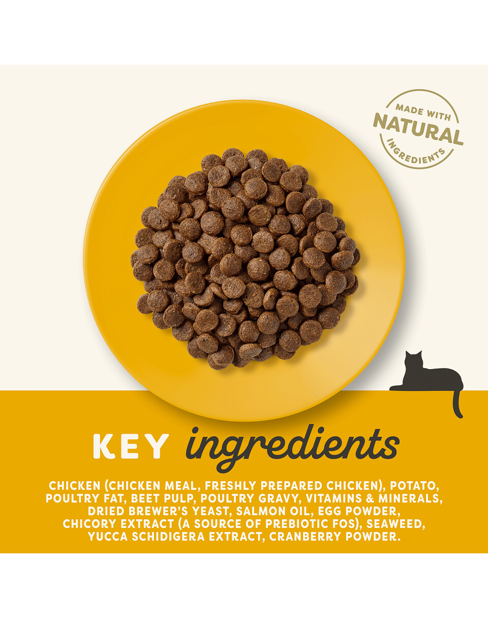 Sastāvs: vistas milti (67%), svaigi malta mājputnu gaļa (12%) (dabīgs glikozamīna un hondroitīna avots), kartupeļi, biešu mīkstums, alus raugs, mājputnu mērce (1%), augu celulozes šķiedrvielas (0,03%), laša eļļa, kokosriekstu eļļa (dabīgs vidējas ķēdes taukskābju triglicerīdu avots), vitamīni un minerālvielas, žāvētas olas, nātrija hlorīds, kalcija karbonāts, jūras aļģes, dzērvenes, dl-metionīns, kālija hlorīds, juku ekstrakts, citrusaugļu ekstrakts, rozmarīna ekstrakts.