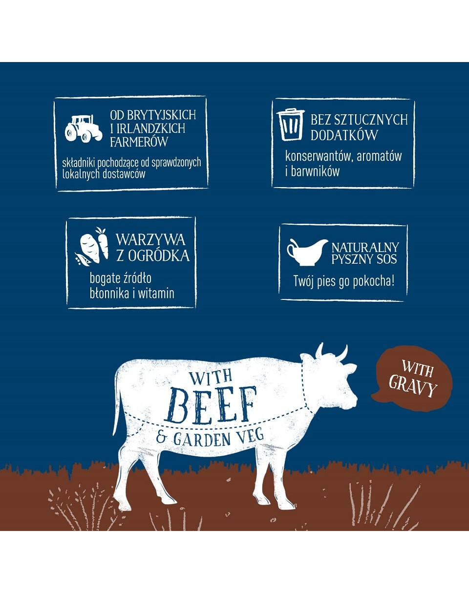 Pilnvērtīga suņu barība, pasniegta sulīgu gabalu veidā ar liellopu gaļu, garšīgā mērces ar dārzeņiem tieši no dārza. Lieliski sabalansēta, bezgraudu recepte, kas balstīta uz dabīgas izcelsmes sastāvdaļām, noteikti iepriecinās jūsu četrkājaino draugu un nodrošinās to ar visām nepieciešamajām uzturvielām.