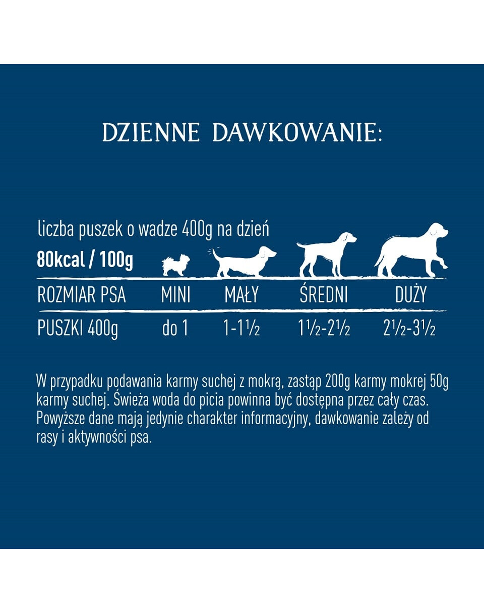 Ja barību pasniedz kopā ar sauso barību, aizvietojiet 200g mitrās barības ar 50g sausās barības. Tīram dzeramajam ūdenim jābūt pieejamam visu laiku. Blakus esošie dati ir tikai informatīvi, deva ir atkarīga no šķirnes un aktivitātes.