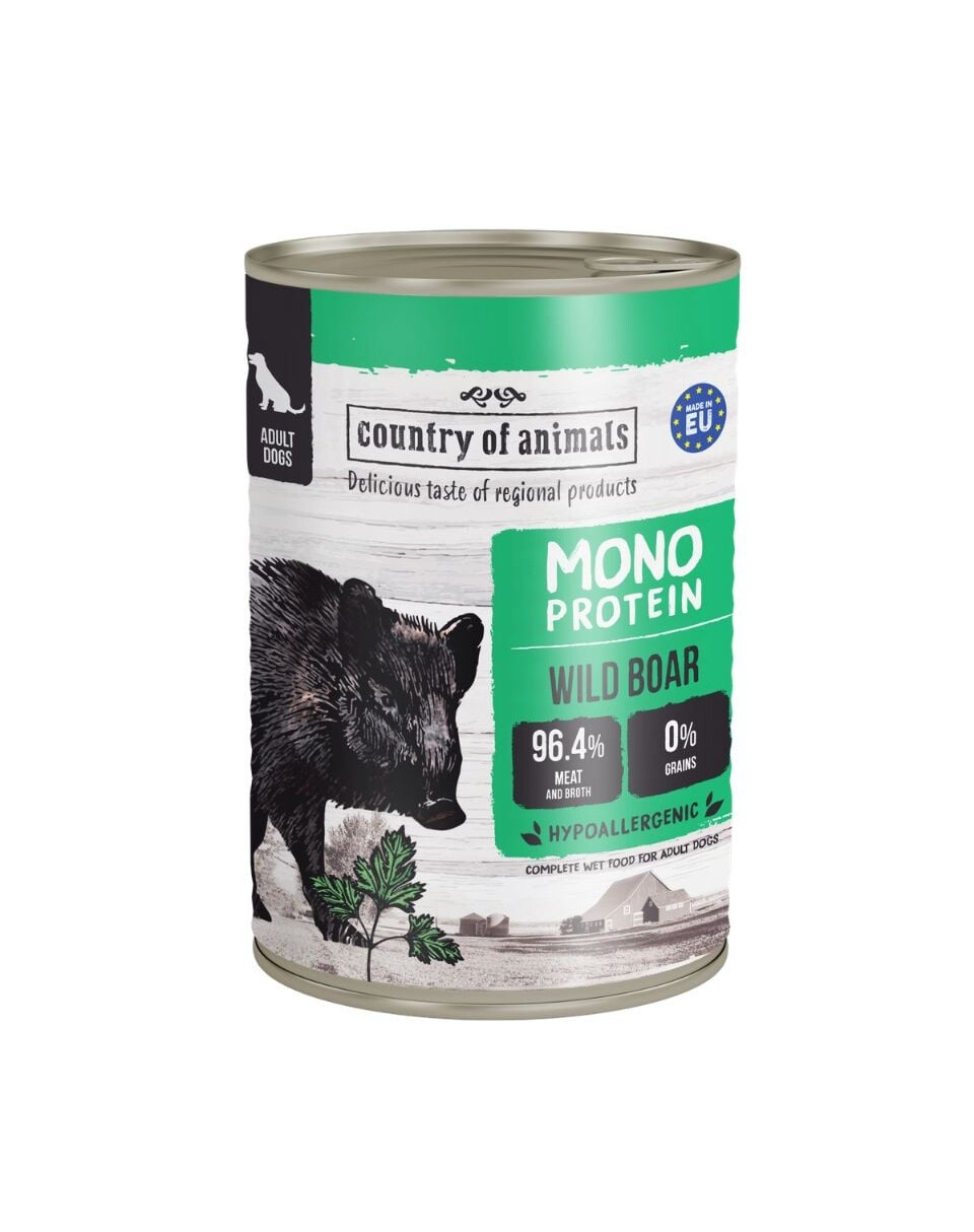 Mitrā monoproteīna barība Country of Animals ir vairāk nekā parasta ikdienas maltīte jūsu mīlulim. Tā ir īsta svētku maltīte, kurā izcila garša apvienojas ar unikālu, veselīgu sastāvu, kas rūpējas par suņa veselību un maigo gremošanas sistēmu.