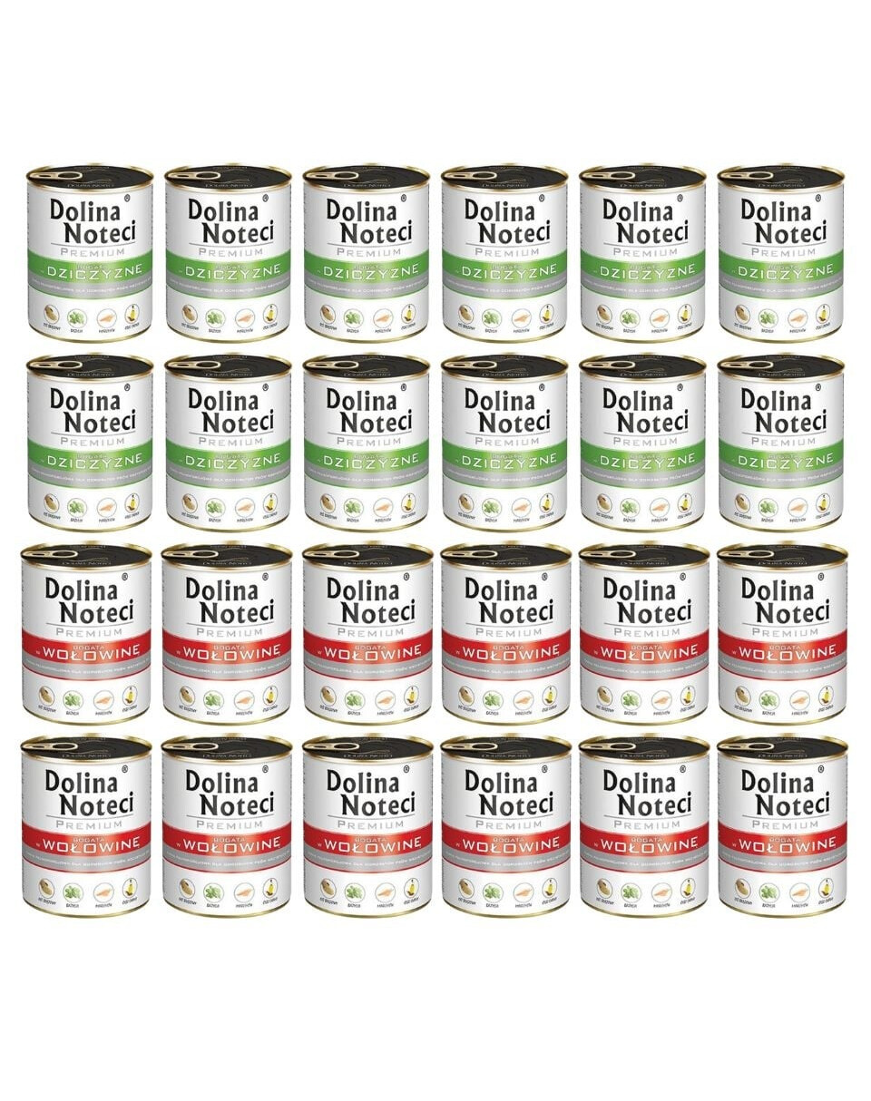 Komplekts DOLINA NOTECI Mix garšu Premium Bagāta ar liellopu gaļu un meža dzīvnieku gaļu 24x800g ietver: