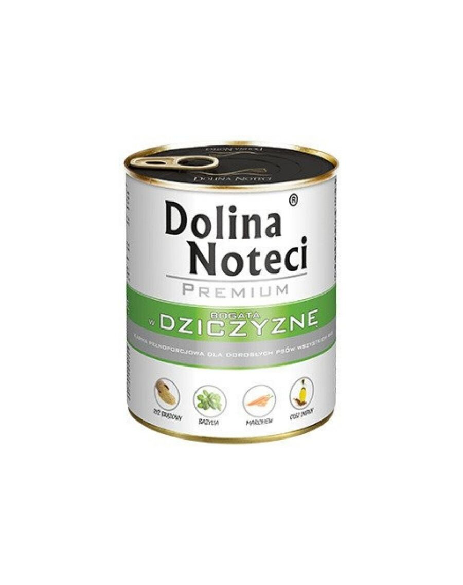 Sastāvs: gaļa un dzīvnieku izcelsmes produkti 65% (no tiem medījuma gaļa 15%), dārzeņi (burkāni 1,7%), graudaugi (dabīgie brūnie rīsi 1,2%), eļļas un tauki (linsēklu eļļa 0,2%), minerālvielas, baziliks 0,01%.
