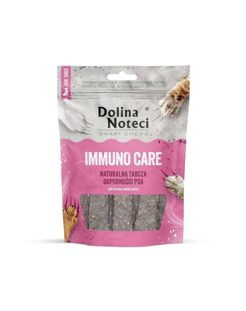 Dolina Noteci Smart Chews Immuno Care ir žāvēti gardumi, kas izstrādāti pieaugušiem suņiem visu šķirņu. Tie satur pat 80% gaļas un dzīvnieku izcelsmes produktu, tādējādi tie ir īpaši garšīgi un vērtīgi uzturvērtības ziņā. Tie ir bagāts olbaltumvielu, aminoskābju un taukskābju avots, kas palīdz uzturēt optimālu stāvokli un veselību četrkājainajiem draugiem.