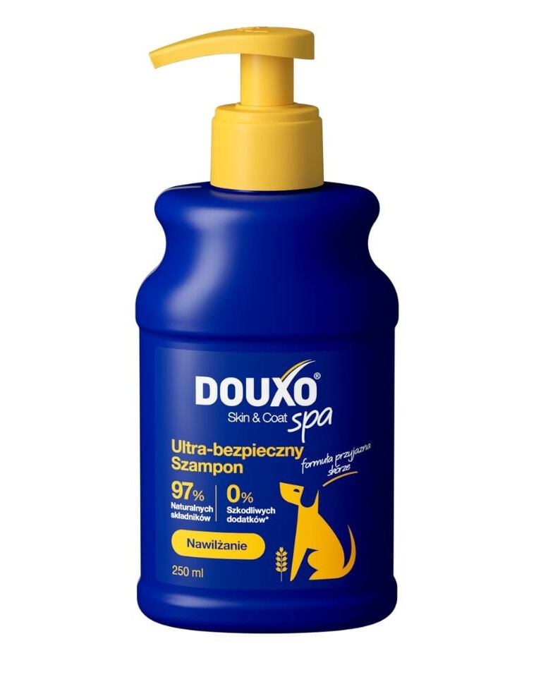 DOUXO Skin & Coat SPA – Ultra-drošs mitrinošs šampūns suņiem. Attīra un intensīvi mitrina ādu, izceļ spalvas mirdzumu, atstāj to mīkstu un spīdīgu. Formula, kas ir draudzīga ādai.