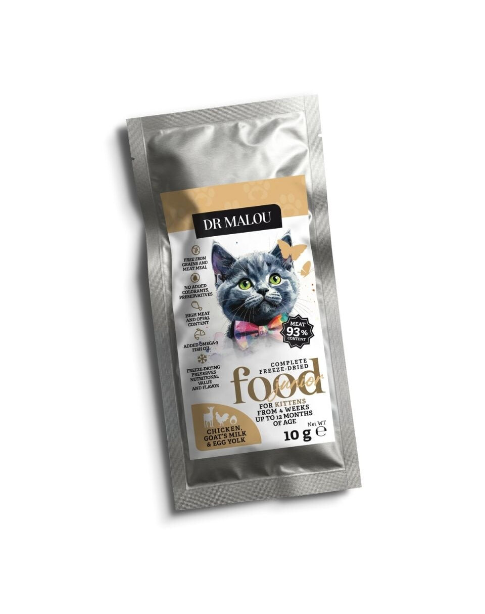 Rūpējieties par sava kaķēna veselīgu sākumu ar Dr Malou barību – pilnīga recepte no dabīgām sastāvdaļām, liofilizēta, lai saglabātu svaigumu un uzturvērtības. Izcila sastāva ar lielu gaļas, iekšējo orgānu un kazas piena daudzumu nodrošina visu, kas jaunam kaķim nepieciešams pareizai attīstībai.
