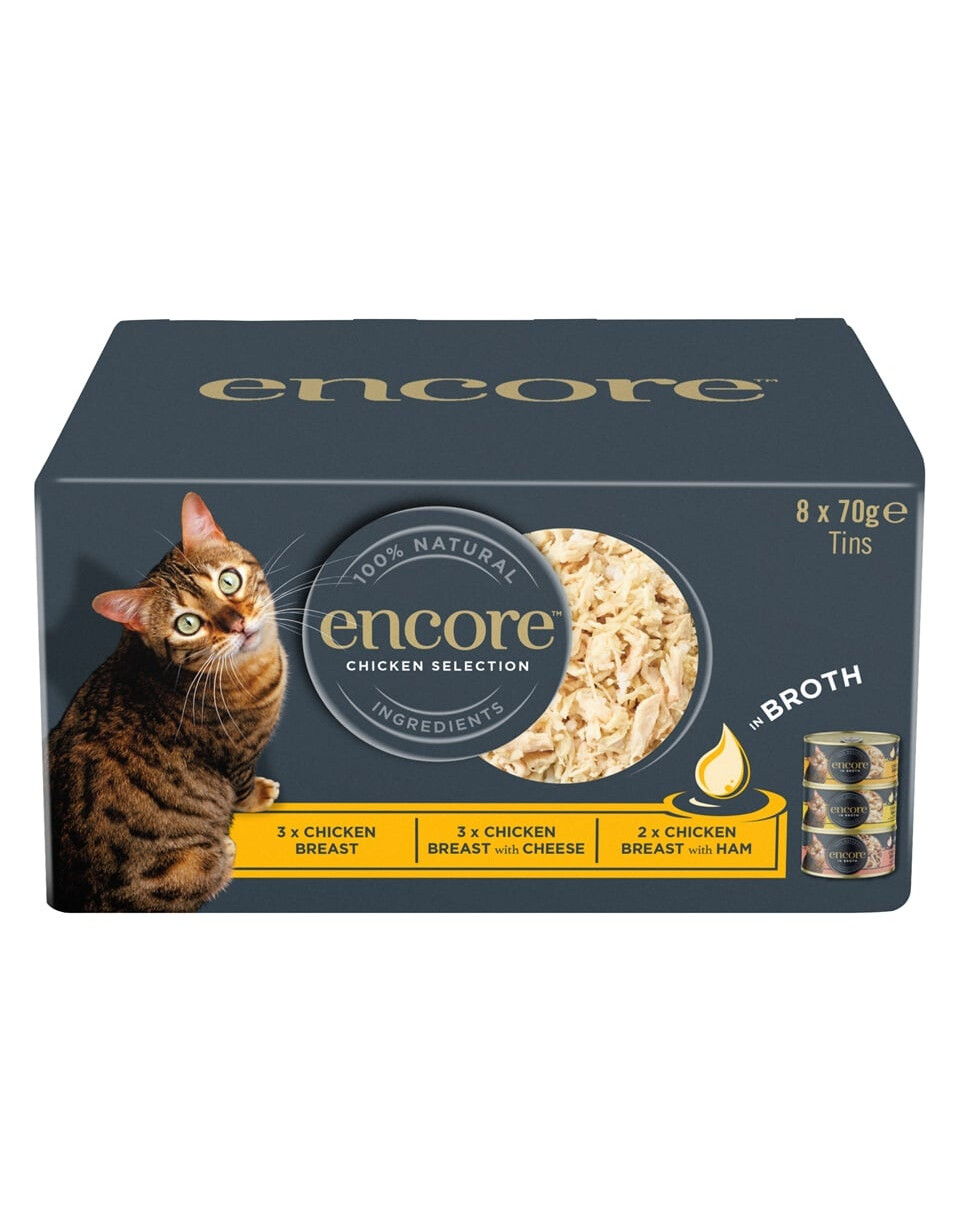 Dabiska, bezgraudu papildbarība pieaugušiem kaķiem. Komplektā ir 8 paciņas × 70 g, kas piedāvā dažādu garšu maisījumu, pamatojoties uz augstākās kvalitātes vistas krūtiņām, kas iemērktas vieglā buljonā. ENCORE zīmola recepte izceļas ar vienkāršu sastāvu, nevajadzīgu piedevu trūkumu un augstu gaļas saturu – ideāli piemērota kaķiem, kuriem nepieciešama dažādība uzturā vai kuriem ir jutīga gremošanas sistēma.