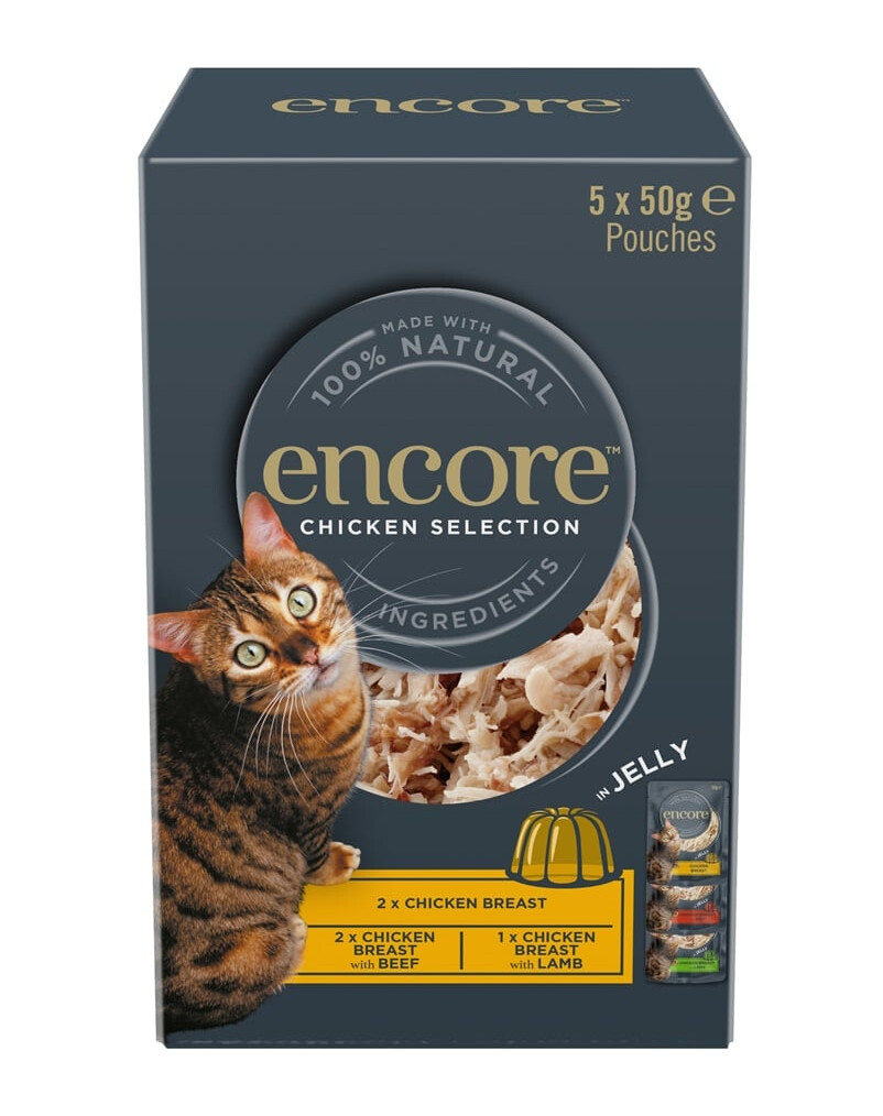 ENCORE Cat Adult Chicken Selection in Jelly ir dabīgs papildbarība pieaugušiem kaķiem, pieejams multipakā ar 5 iepakojumiem pa 50 g katrs. Komplektā ir dažādi garšas varianti, kas balstīti uz vistas krūtiņu, iesaiņoti vieglā, garšīgā želejā (“in Jelly”), kas palielina ēdiena pievilcību. Produkta formula balstās uz dabīgām sastāvdaļām, bez mākslīgām krāsvielām un konservantiem.