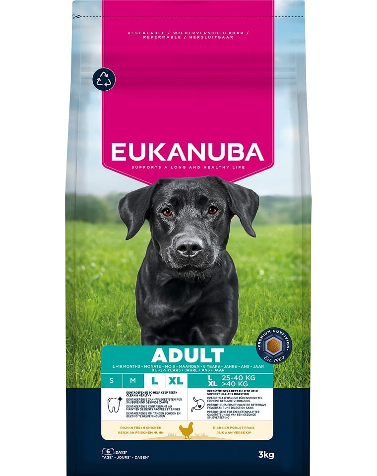 Sausā barība EUKANUBA pieaugušiem suņiem, bagāta ar svaigu vistu, ir 100% pilnīga un sabalansēta, un ir ideāla lielo šķirņu suņiem vecumā no 18 mēnešiem līdz 6 gadiem (vai 2–5 gadiem milzu šķirnēm).
