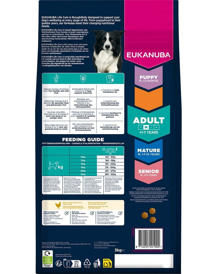 EUKANUBA Life Care ir premium barības līnija, kas izstrādāta sadarbībā ar uztura ekspertiem, lai nodrošinātu suņiem barošanu, kas pielāgota viņu vecumam un vajadzībām. Šī recepte ir sagatavota īpaši pieaugušiem vidējo šķirņu suņiem, kuri no 1. līdz 7. dzīves gadam nepieciešama diēta, kas atbalsta viņu enerģiju, imunitāti un dzīvotspēju.