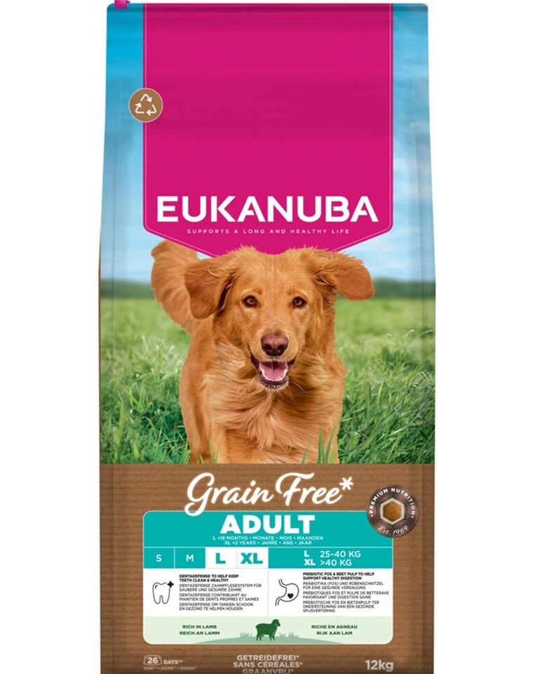 EUKANUBA Grain Free Adult Large Lamb ir pilnvērtīga, bezgraudu sausā barība, kas izstrādāta īpaši pieaugušiem lielu šķirņu suņiem. Receptūra ir pielāgota viņu specifiskajām uztura vajadzībām, atbalstot pareizu kondīciju, gremošanas sistēmas veselību, kā arī stipras kaulus un zobus.