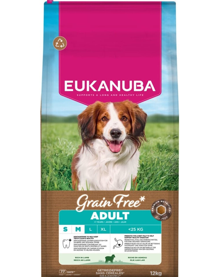 EUKANUBA Grain Free Adult Small & Medium Lamb ir pilnvērtīga, bezgraudu sausā barība, kas paredzēta pieaugušiem mazo un vidējo šķirņu suņiem, kas vecāki par 1 gadu. Recepte ar zemu alergēnu saturu ir izstrādāta, domājot par suņiem ar jutīgu gremošanas sistēmu un tendenci uz graudu nepanesamību, atbalstot viņu ikdienas kondīciju un labklājību.