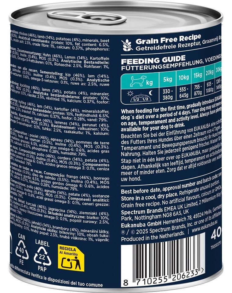 Recepte balstās uz vistu, bagātinātu ar jēra gaļu un kartupeļiem, kas padara barību par vērtīgu olbaltumvielu un enerģijas avotu. Laša eļļa nodrošina nepieciešamās Omega-3 taukskābes, kas atbalsta ādu un apmatojumu, bet biešu mīkstums, inulīns un prebiotikas MOS palīdz pareizai gremošanai. Sabalansēts kalcija saturs veicina stipras kaulus un veselīgu skeleta sistēmu.
