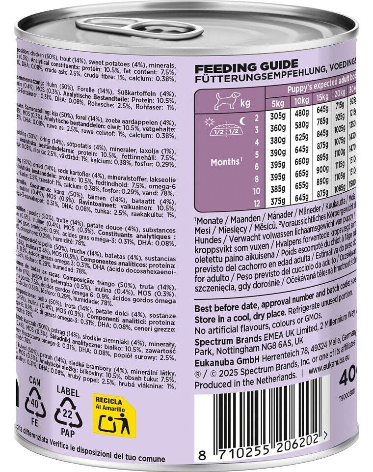 Barība ir rupjas konsistences pastēte ar redzamām gaļas un dārzeņu gabaliņiem, kas padara to īpaši garšīgu un pievilcīgu kucēniem. Tā nesatur mākslīgas krāsvielas, aromatizētājus vai konservantus. To var pasniegt atsevišķi vai kā papildinājumu sausai EUKANUBA barībai, veidojot pilnvērtīgu un daudzveidīgu maltīti.