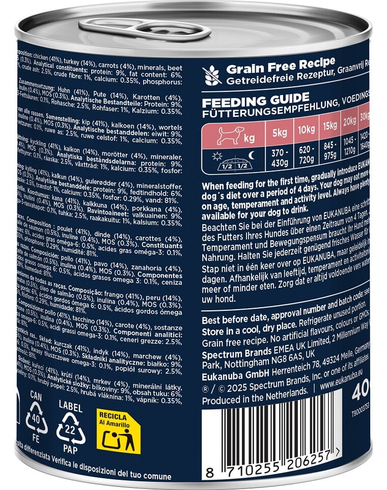 Barība ir rupjas konsistences pastēte ar redzamām gaļas un dārzeņu gabaliņiem, tāpēc tā ir īpaši garšīga un suņi to labprāt ēd. Produkts nesatur mākslīgas krāsvielas, aromatizētājus vai konservantus. To var pasniegt kā pilnvērtīgu maltīti vai kombinācijā ar sauso EUKANUBA barību, radot veselīgu un barojošu svētku mielastu.