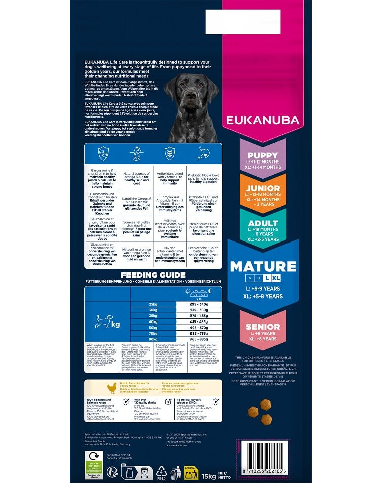 EUKANUBA Life Care ir premium barības līnija, kas izstrādāta, pamatojoties uz zinātniskiem pētījumiem, un kas atbilst suņu vajadzībām katrā dzīves posmā. Šī barība ir izstrādāta īpaši pieaugušiem lielo šķirņu suņiem vecumā no 6–9 gadiem (gigantiskām šķirnēm: 5–8 gadi), nodrošinot vērtīgu olbaltumvielu no svaigas vistas un pilnvērtīgus komponentus, kas atbalsta veselīgu novecošanu un vitalitāti.