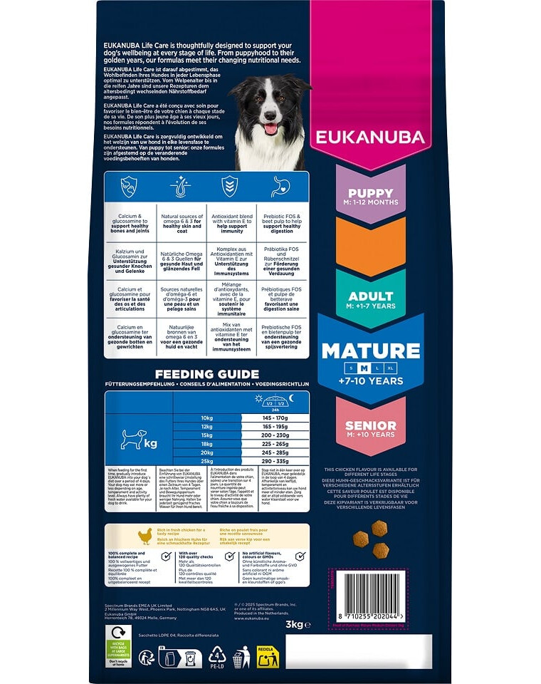 EUKANUBA Life Care ir premium barības līnija, kas izstrādāta, pamatojoties uz zinātniskiem pētījumiem, lai nodrošinātu suņiem vērtīgas uzturvielas, kas pielāgotas viņu mainīgajām vajadzībām katrā dzīves posmā. Šī recepte ir izstrādāta īpaši pieaugušiem vidējo šķirņu suņiem vecumā no 7 līdz 10 gadiem, kuriem nepieciešama diēta, kas atbalsta veselīgu novecošanu, dzīvotspēju un optimālas kondīcijas saglabāšanu.