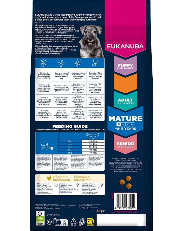 EUKANUBA pieaugušiem suņiem, bagāta ar svaigu vistu, ir 100% pilnīga un sabalansēta sausā barība, kas ir ideāla maziem suņiem vecumā no 8–11 gadiem, nodrošinot augstas kvalitātes olbaltumvielas, kas atbalsta muskuļu spēku un pareizu organisma kondīciju.