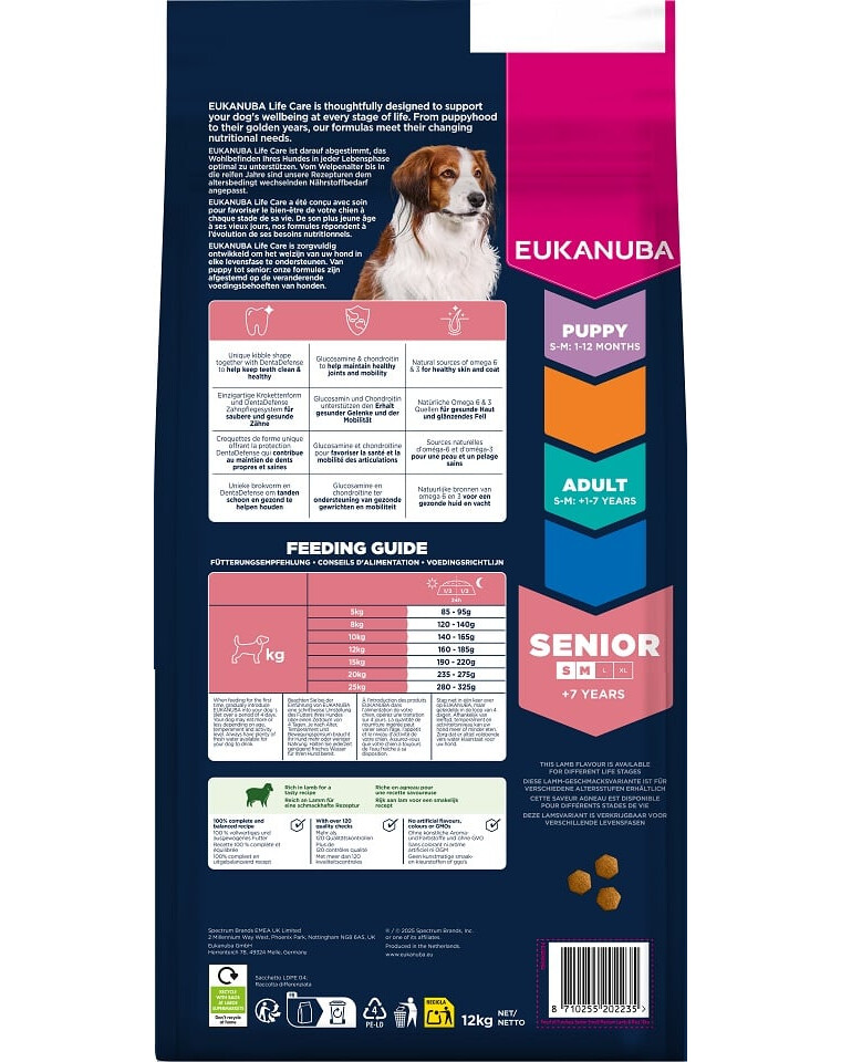 EUKANUBA Life Care ir premium barība, kas izstrādāta, pamatojoties uz zinātniskiem pētījumiem, kas atbilst mainīgajām suņu vajadzībām katrā dzīves posmā. Šī barība ir izstrādāta vecākiem suņiem mazo un vidējo šķirņu (virs 7 gadiem), nodrošinot viegli sagremojamus rīsus un augstas kvalitātes jēra gaļu – ideāli arī suņiem ar jutīgu kuņģi.