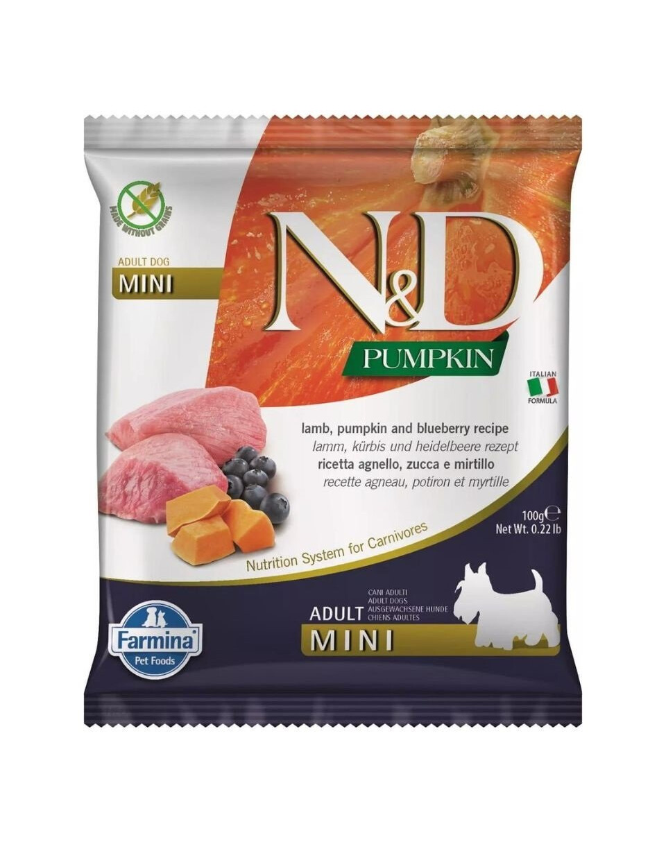 Pilnvērtīga barība pieaugušiem suņiem, jēra gaļa, ķirbis un mellenes.