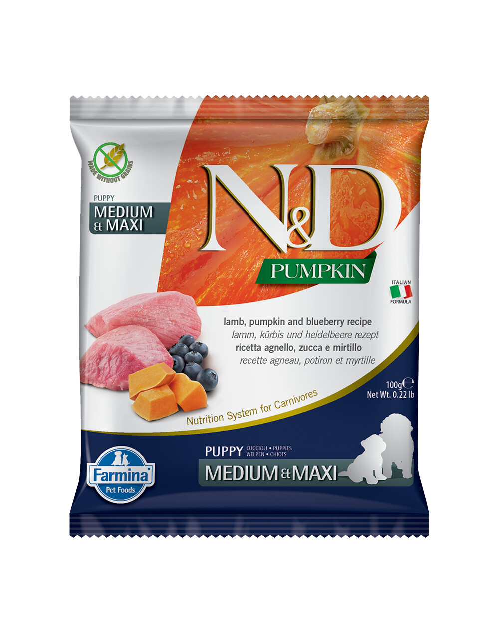 Pilnvērtīga barība kucēniem un grūsnām vai laktējošām kucēm, jēra gaļa, ķirbis un mellenes.