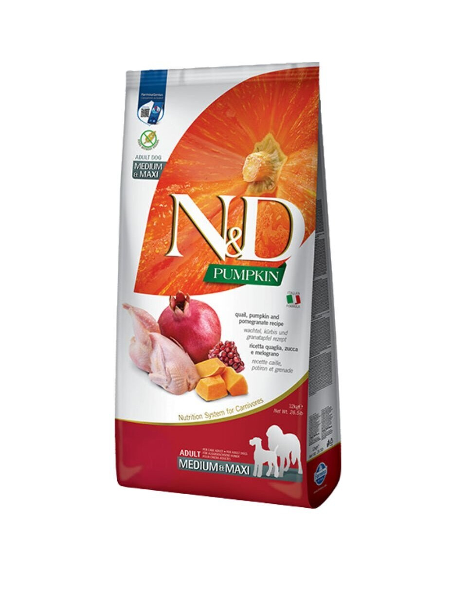 Pilnvērtīga barība pieaugušiem suņiem ar paipalu, ķirbju un granātābolu augļiem.