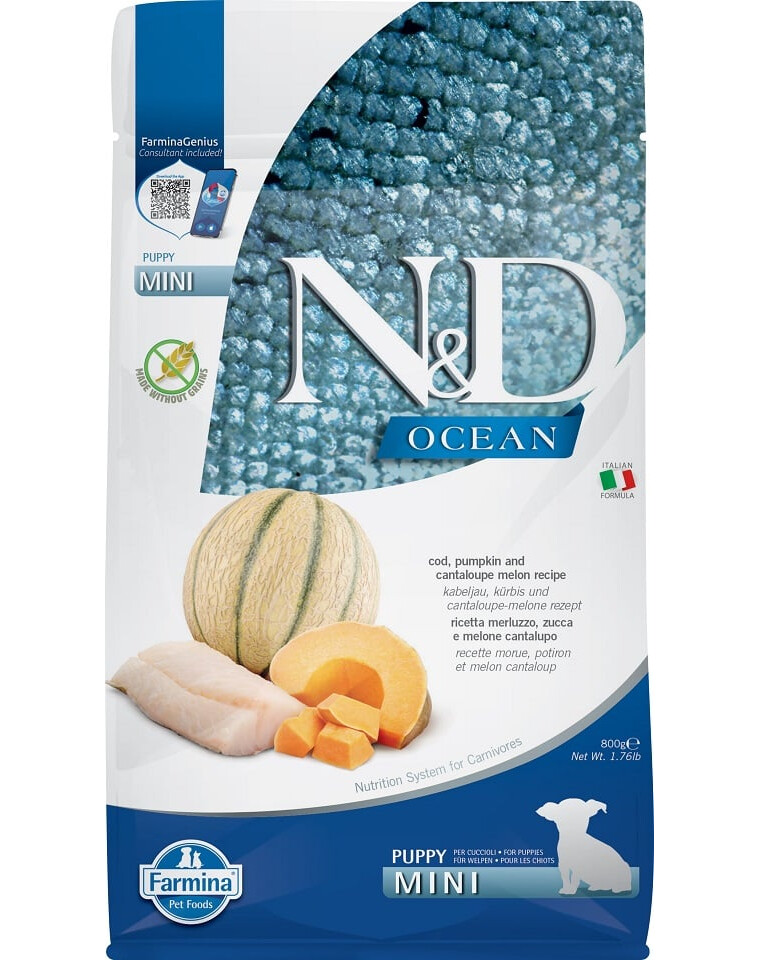 FARMINA N&D Ocean Dog Puppy Mini cod, pumpkin & cantaloupe melon 800 kg menca, ķirbis un kantalupes melone kucēniem un grūsnām kucēm