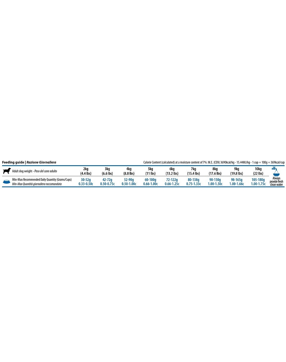 Analīzes: Kopproteīns 23,00%; kopproteīns 12,00%; kopta šķiedrviela 2,80%; mitrums 9,00%; koppelni 7,20%; kalcijs 1,00%; fosfors 0,80%; omega-6 taukskābes 2,20%; omega-3 taukskābes 0,40%; DHA 0,12%; EPA 0,10%; glikozamīns 1200mg/kg; hondroitīna sulfāts 900mg/kg.
