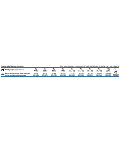 Analīzes: jēlproteīns 23,00%; jēltauki 12,00%; jēlšķiedra 2,80%; mitrums 9,00%; jēlpelni 7,90%; kalcijs 1,10%; fosfors 0,90%; omega-3 taukskābes 0,40%; omega-6 taukskābes 2,20%; DHA 0,20%; EPA 0,10%; glikozamīns 1200mg/kg; hondroitīna sulfāts 900mg/kg.