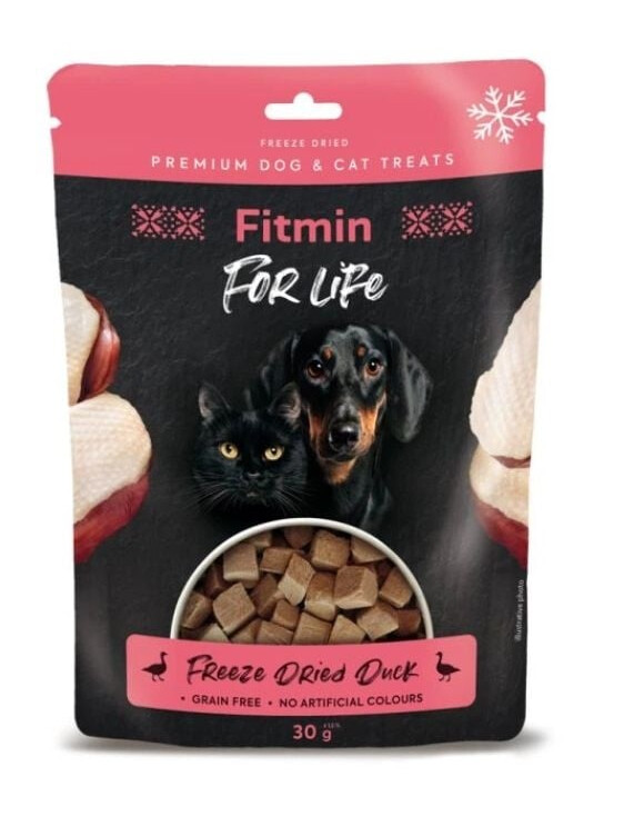 FITMIN For Life Freeze dried duck ir liofilizēts pīļu kārums visiem suņiem un kaķiem.