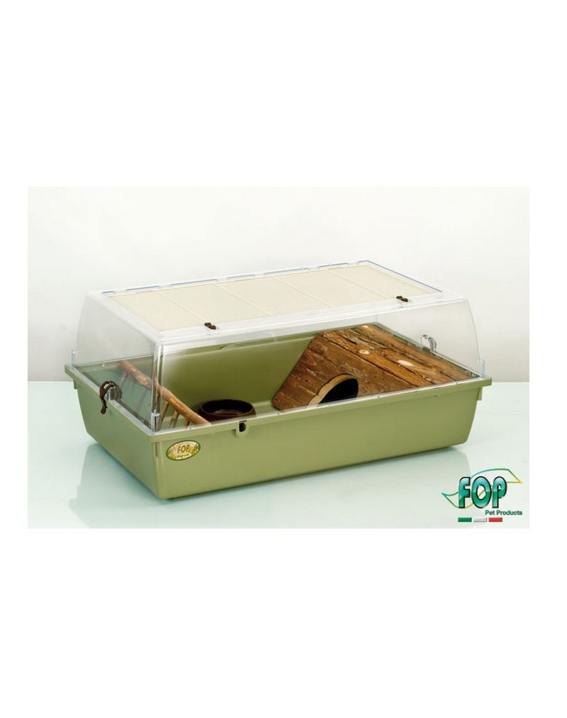 Būris izgatavots no augstas kvalitātes plastmasas, aprīkots ar plauktu siena glabāšanai un koka nojumi. Izmēri 33 x 47 x 75 cm.