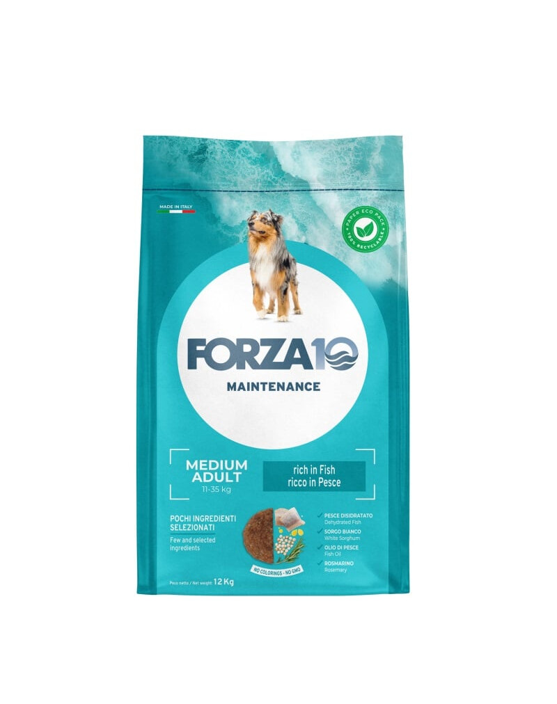 Forza10 Medium Maintenance Fish ir pamatbarība ar zivīm vidēja lieluma šķirnes suņiem, kas izstrādāta tā, lai nodrošinātu optimālu veselību jūsu sunim. Tā satur tikai vienu tīru olbaltumvielu avotu (okeāna zivis) un tīru ogļhidrātu avotu (kukurūza, baltā sorgo, rīsi), lai samazinātu pārtikas alerģiju risku. Ieteicams suņiem, kuri nepanes intensīvi audzētu gaļu.