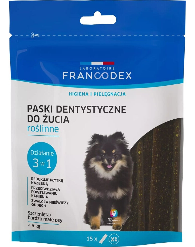 Laboratoire Francodex dārzeņu košļājamās nūjiņas zobakmens un smakas noņemšanai no mutes ir īpaši izstrādātas vismazāko šķirņu suņiem. Pareizais izmērs, "Z" forma un abrazīvā, raupjā virsma nodrošina efektīvu zobu mehānisku tīrīšanu. Sastāvā esošais granātābolu augļu koncentrāts samazina aplikuma veidošanos, kas ir atbildīgs par nepatīkamu smaku. Turklāt divu enzīmu - glikozes oksidāzes un laktoperooksidāzes - kombinācija kavē mikroorganismu augšanu, tādējādi samazinot zobakmens veidošanos. Augu izcelsmes formula samazina pārtikas alerģiju risku.